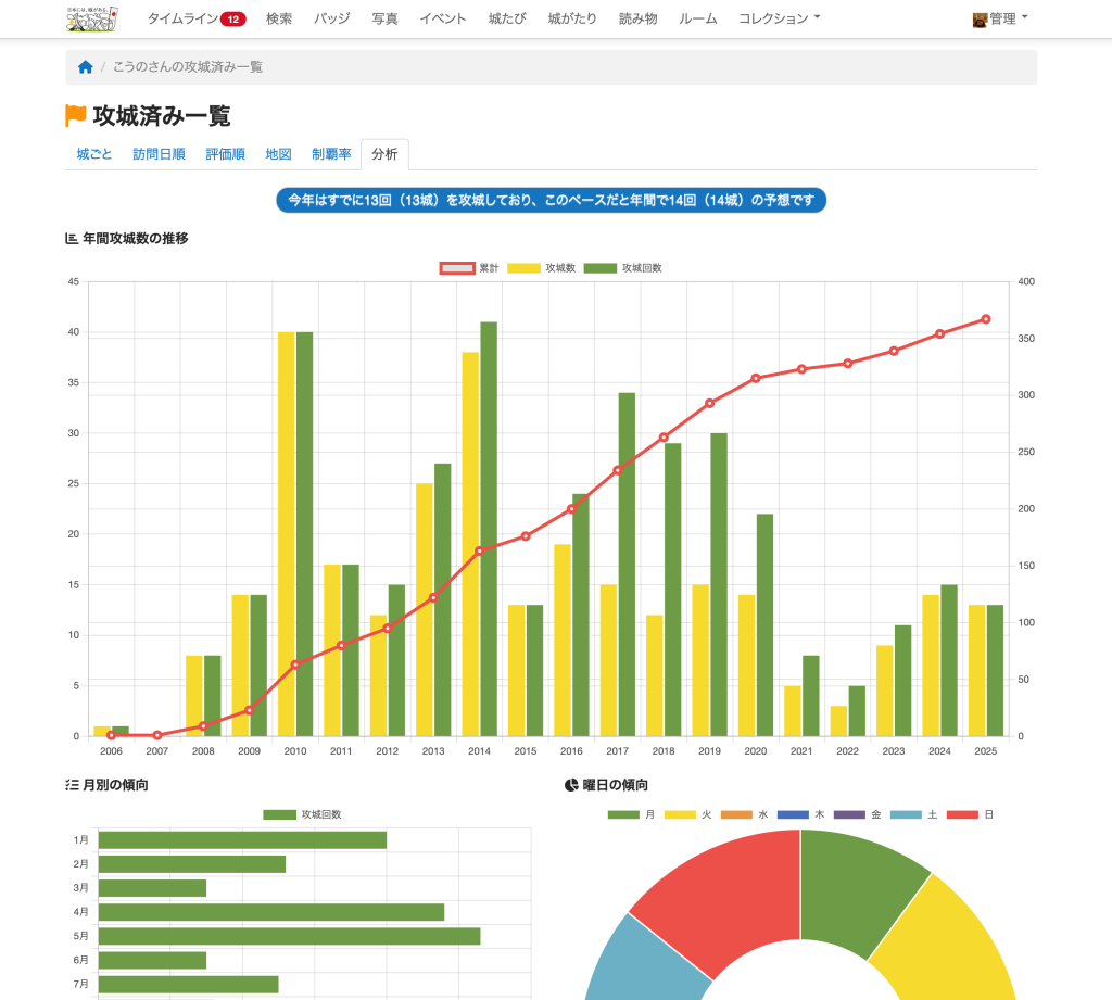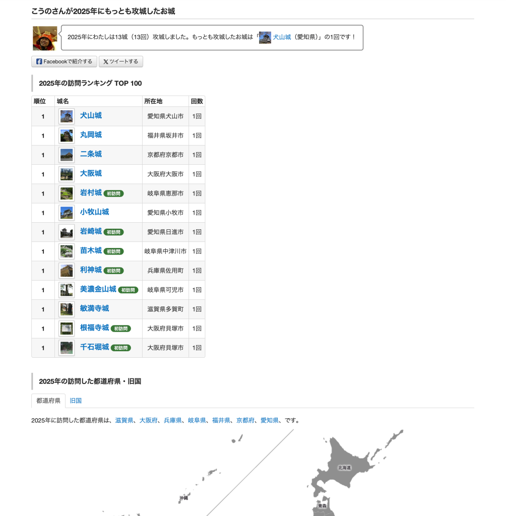 分析のページは自分だけが見れる専用画面ですが、年間集計ページは公開されているので誰でも見ることができます。つまりみなさんもぼくやほかの団員が2025年に訪問したお城をチェックできます。