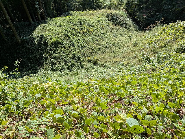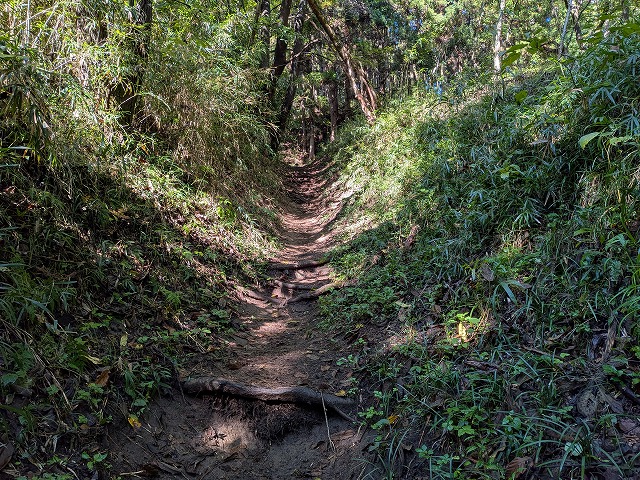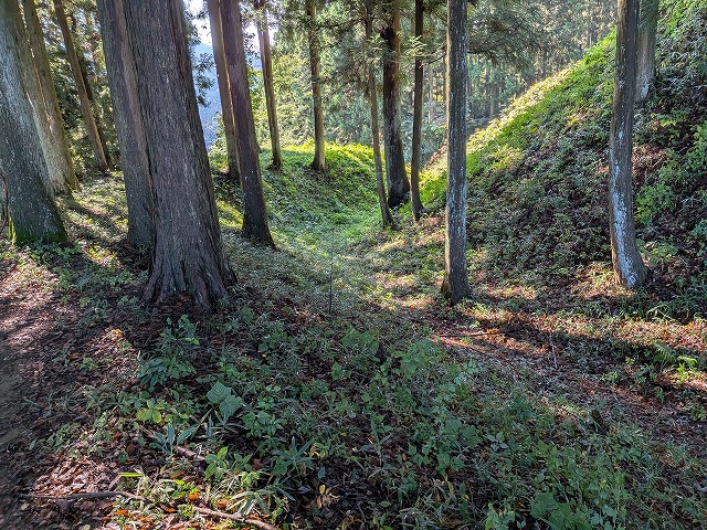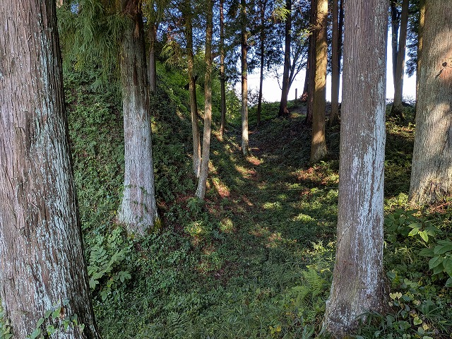 本丸への道を登りながら下を見ると急斜面の土塁と幅の広い長大な竪堀があり防御力が高いことがわかります。