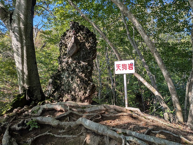 しばらく行くと天狗岩がでてきました。岩の中央部分が天狗の鼻のように見えます。