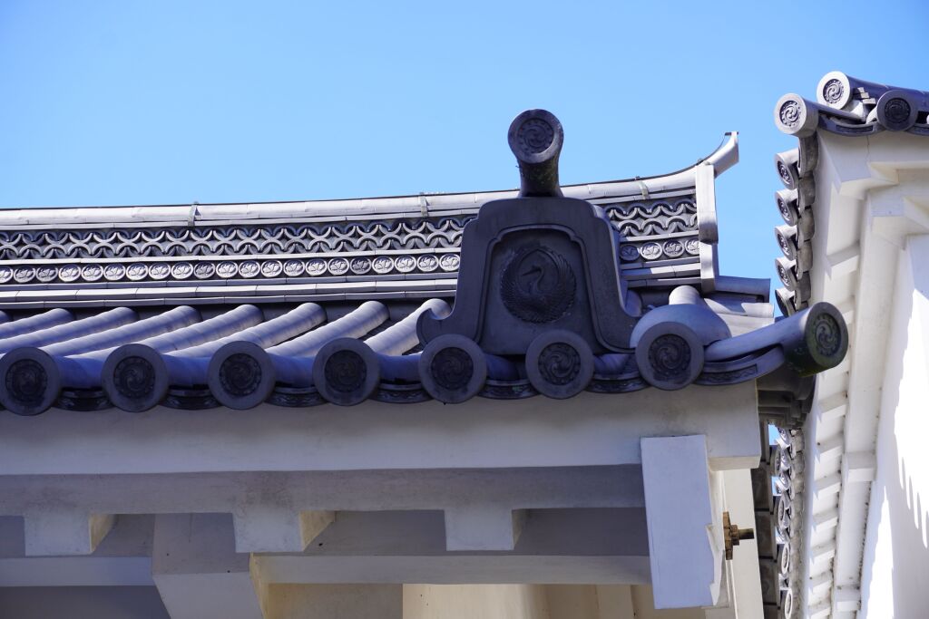 屋根の鬼瓦にはデカデカと森家の家紋がデザインされています。小さいですが池田家の揚羽蝶の家紋もあるのですが、分かりますか?