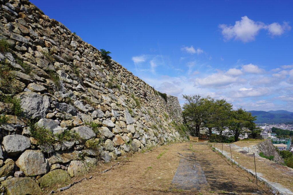 入口から石段を登るとすぐに長大な石垣が出現。一直線にどこまでも続く石垣は迫力があります。