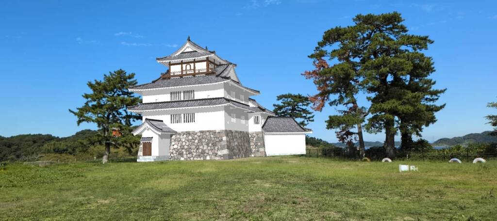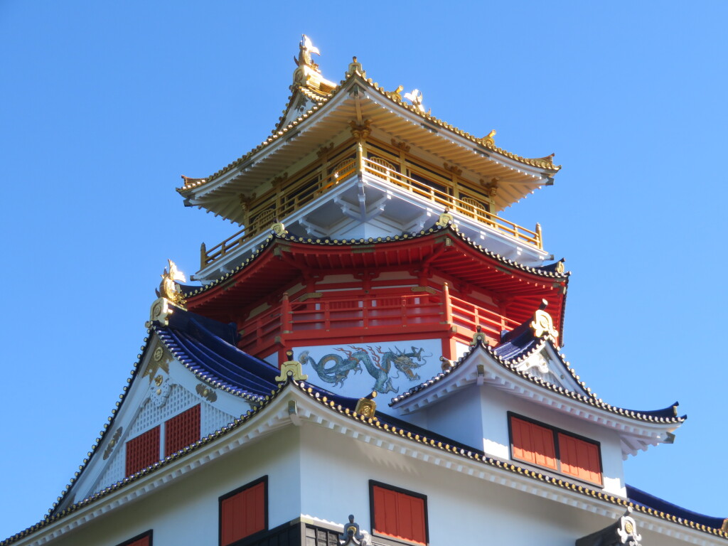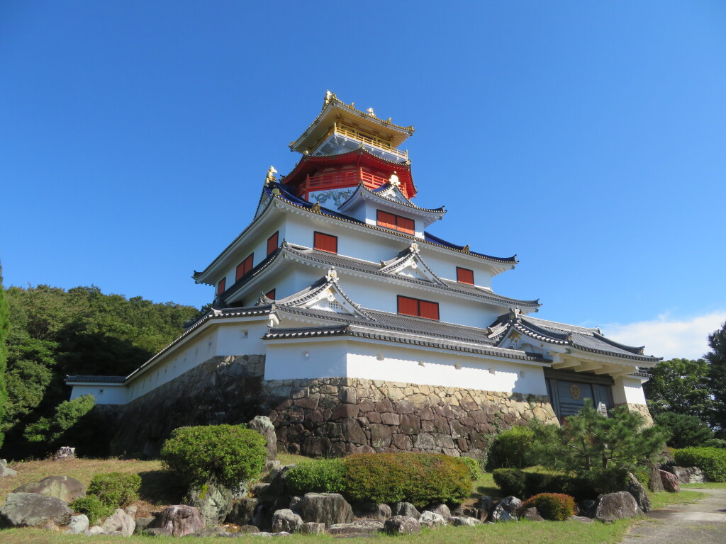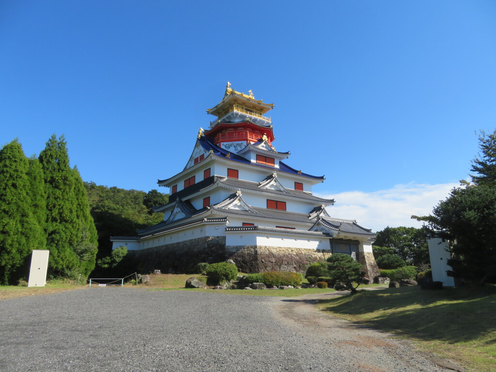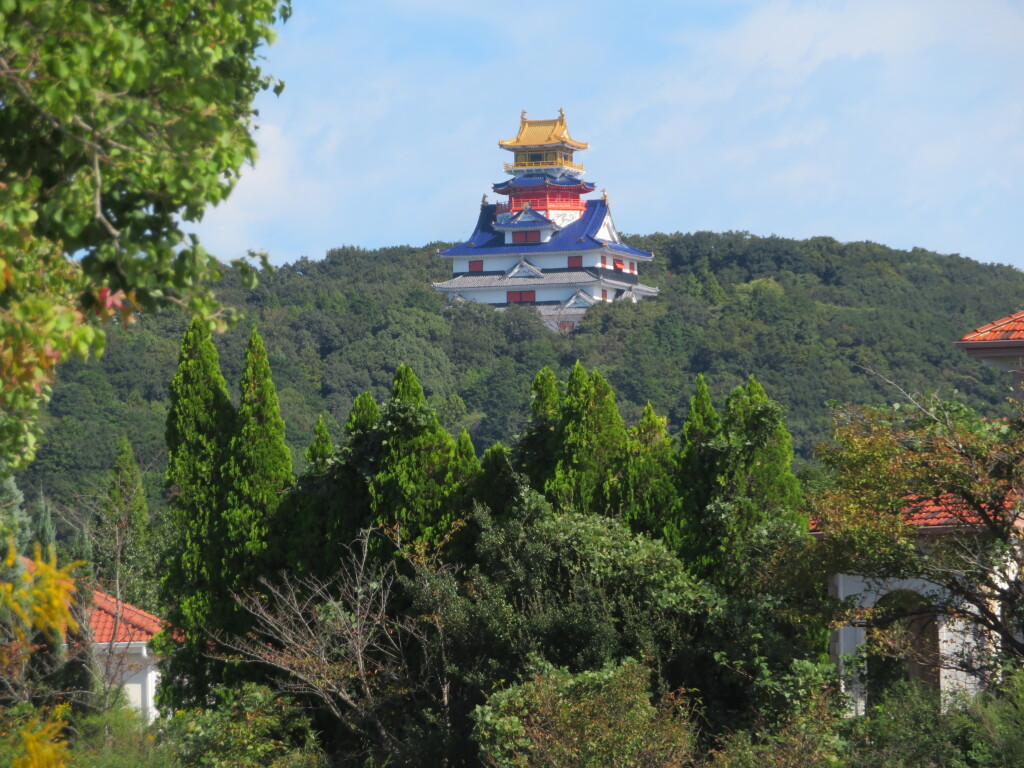 今回、鳥羽城へは「伊勢二見鳥羽ライン」という道路を使ったのですが、途中「朝熊東IC」付近で山上に見覚えのある巨大な天守があるのが目に入ってきました。そうあの信長の幻の城「安土城」です。