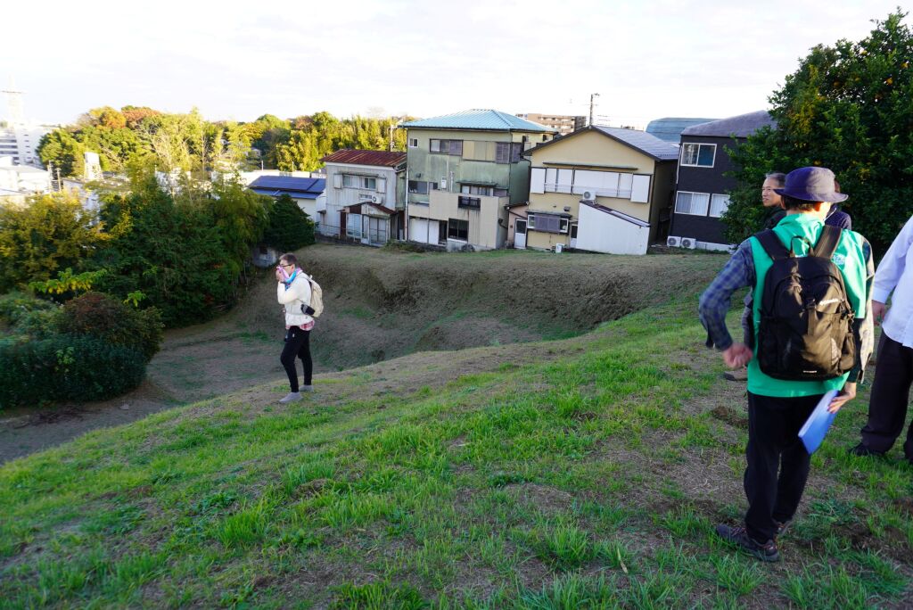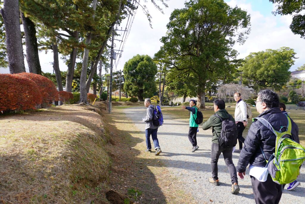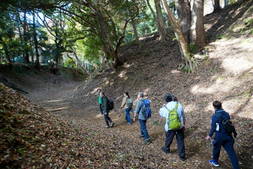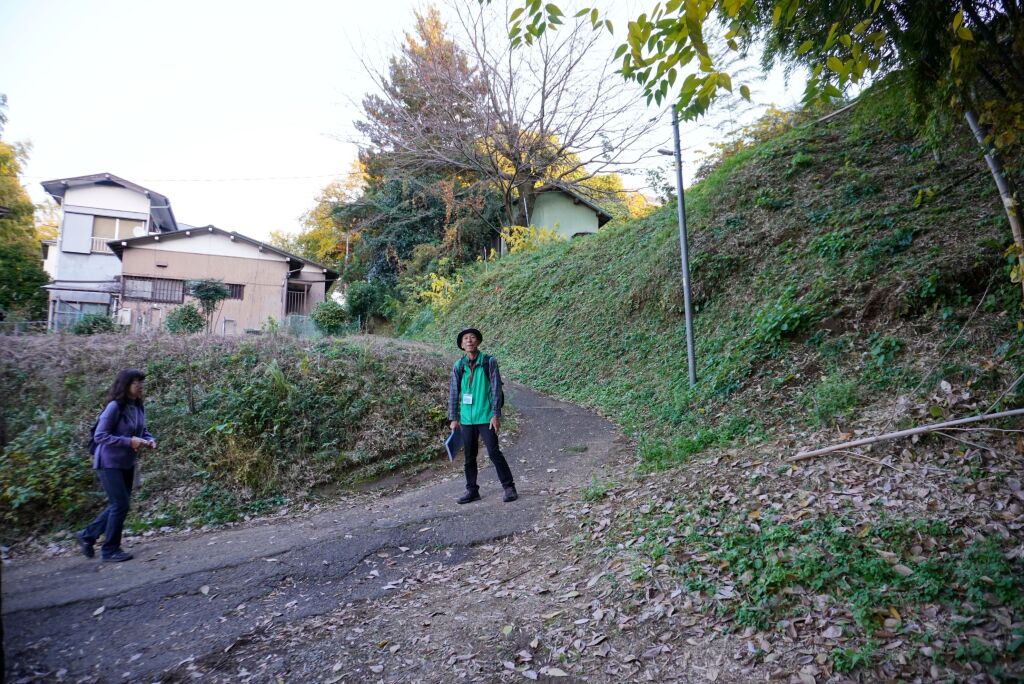 住宅地となっている地区ですが、高台と斜面の境に沿って土塁が続いていたという説明を聞きながら、総構えの痕跡を求めて進みます。