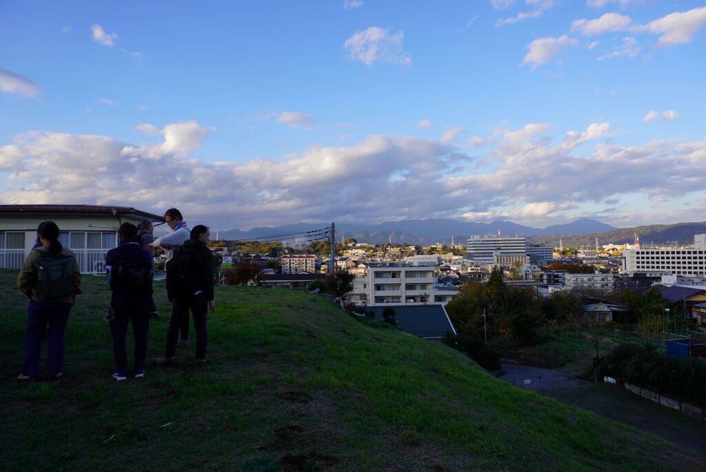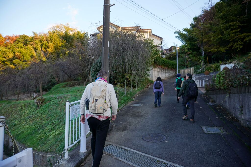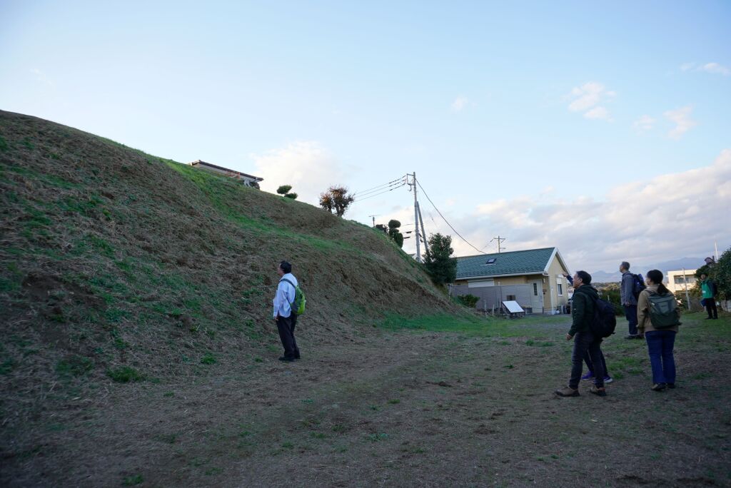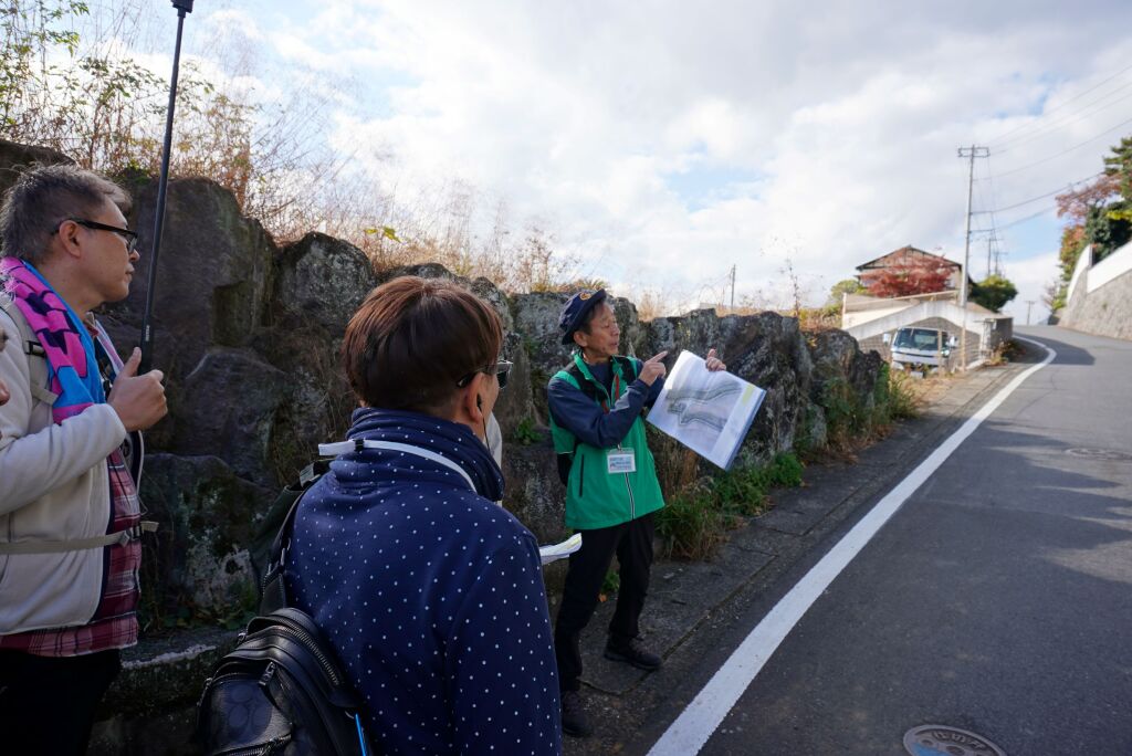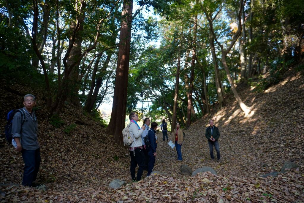 住宅地となっている地区ですが、高台と斜面の境に沿って土塁が続いていたという説明を聞きながら、総構えの痕跡を求めて進みます。
