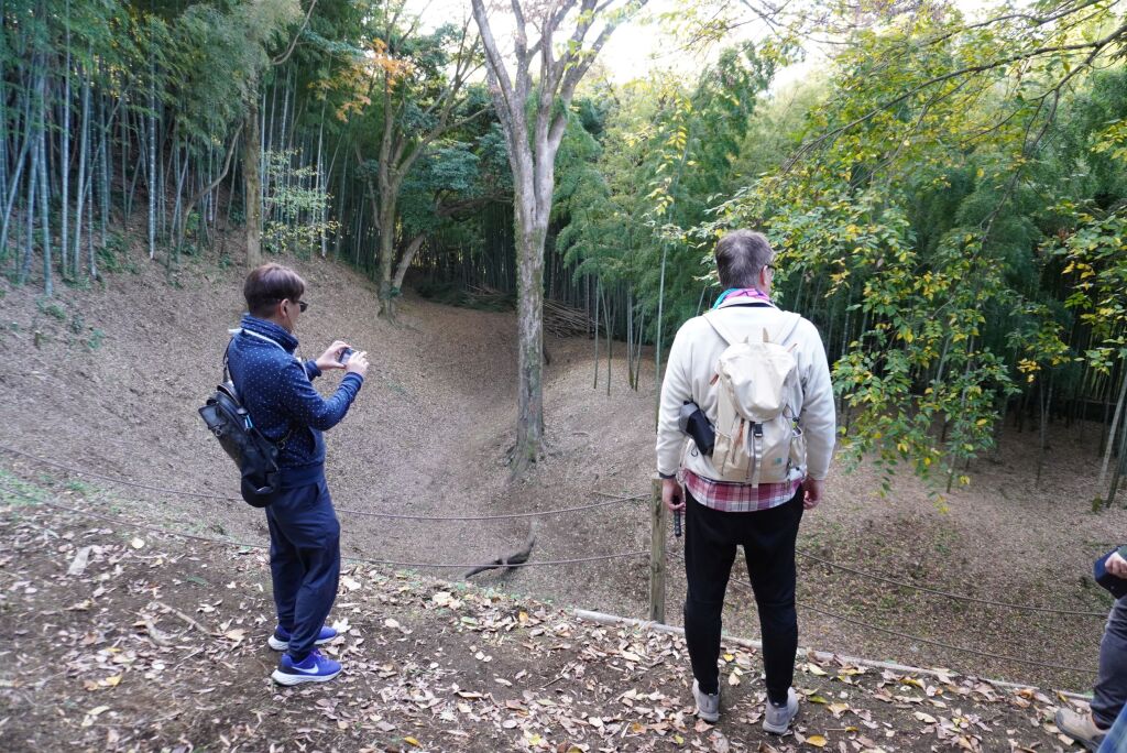 枯れ葉が堆積していることもあり、斜面を登ろうにもずるずると滑って上手くいきません。諦めて堀底を歩いて脱出しようとすると……。