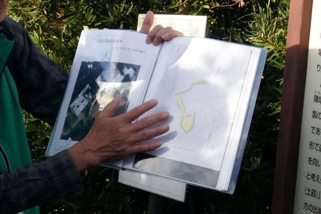 資料の右側にある弾丸のような形の陣地ですが、尖っている側が小田原城を向いているので豊臣方の陣地という説と、北条領で作られた土器が発掘されたため北条方の陣地という説があるようです。