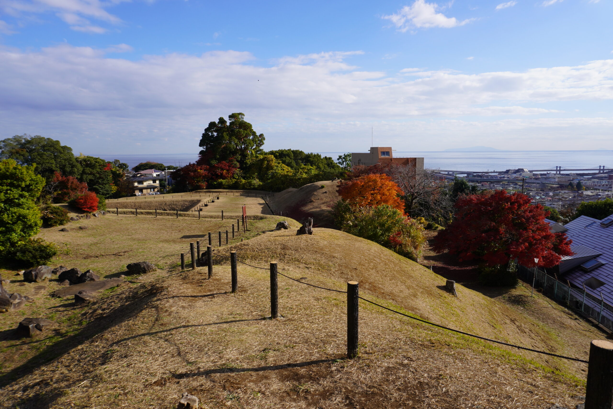 小田原城は細長い尾根の先端にあった城のため、麓からは高い位置にありますが、より高い山の方から攻め込むことができてしまいます。それを防ぐために空堀を掘っているのですが……。