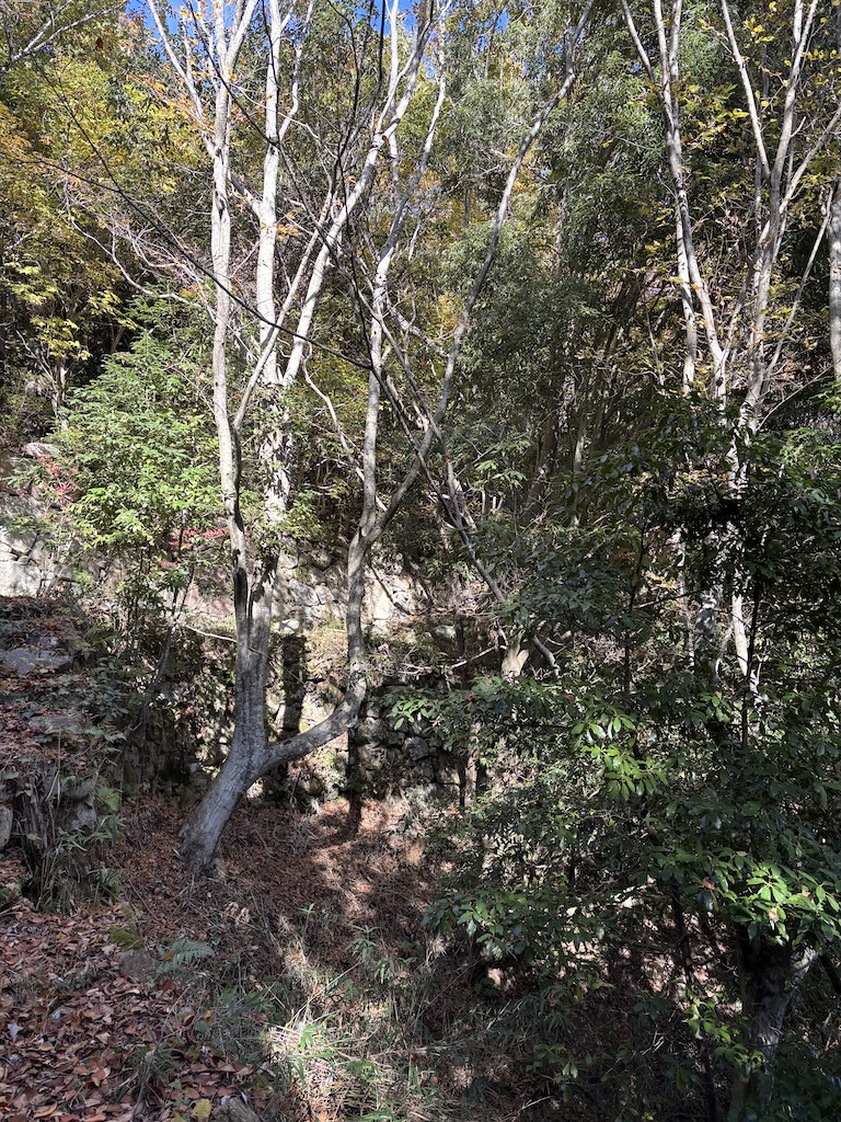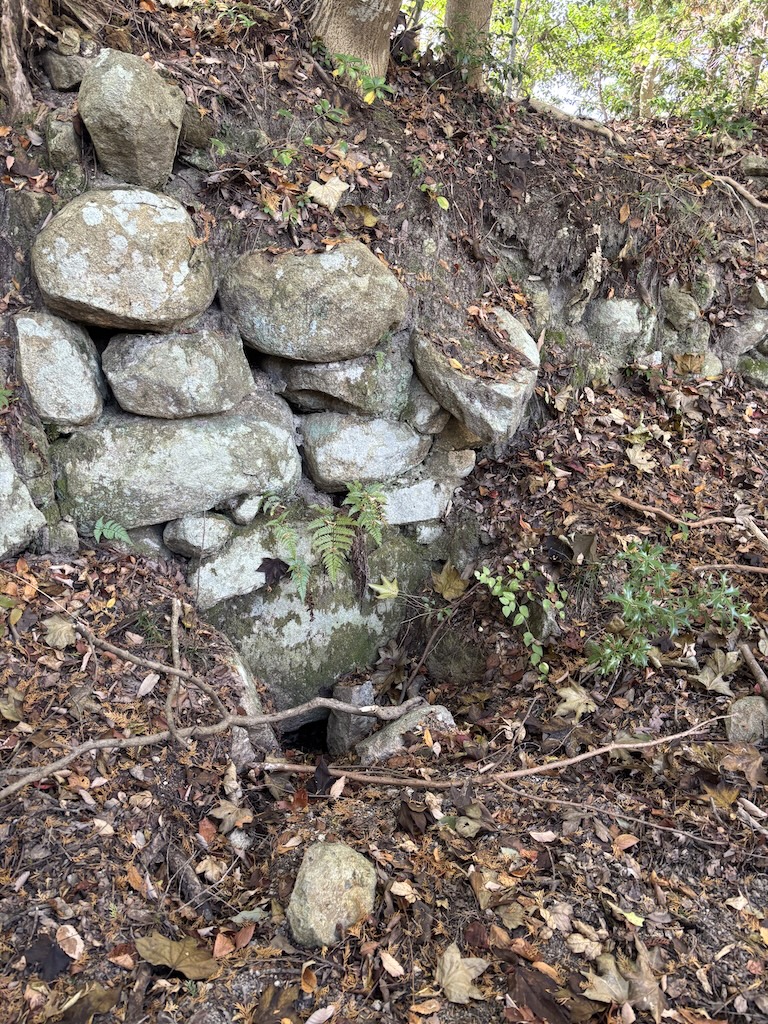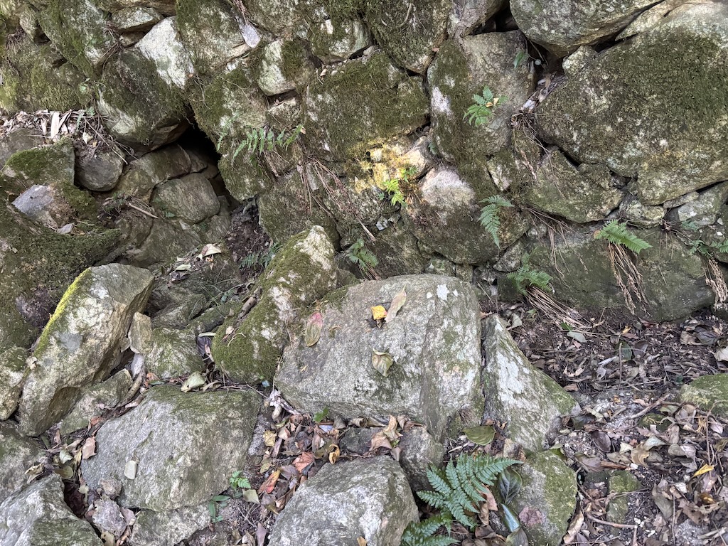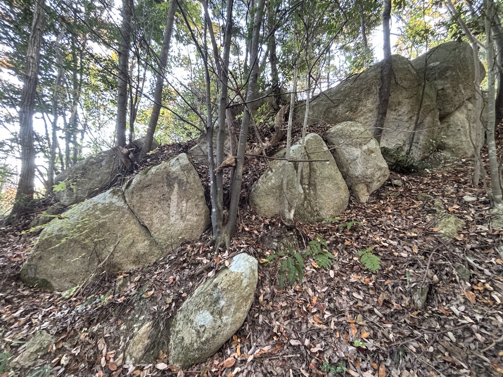 あちこちに、石垣が崩れたような、大きな石が集積しており周囲には木が生い茂っている場所がありました。