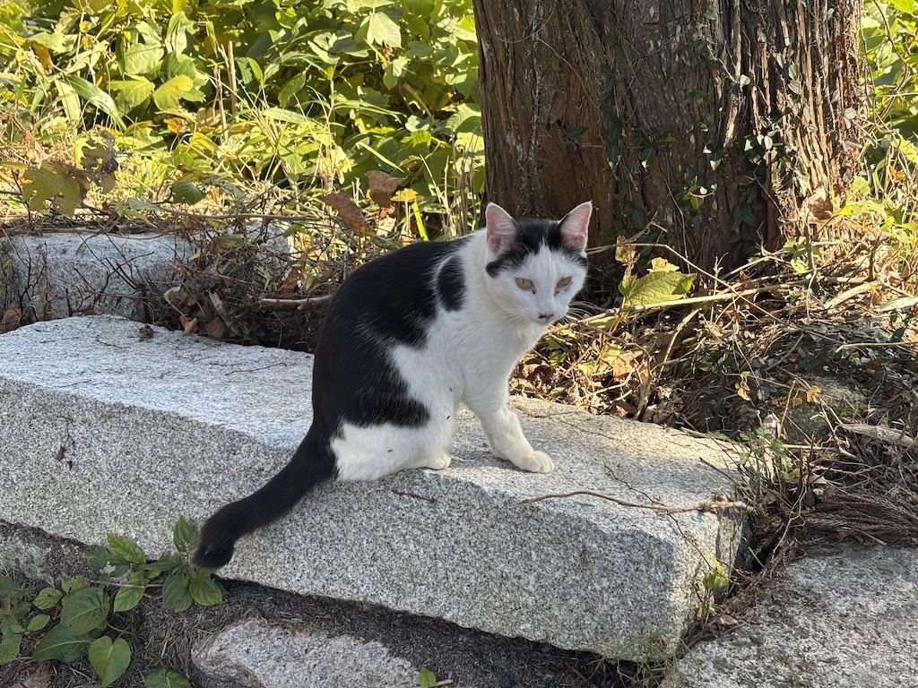 細身ですが、毛並みは綺麗で撫でても嫌がらないし、お腹を出したので、多くの参拝客に可愛がられているのでしょう。猫がいる石の上に座ってお昼をいただきました。