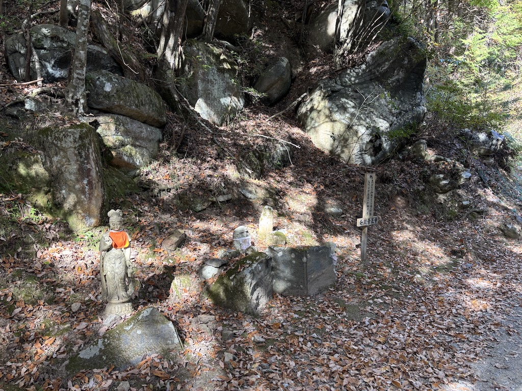 道筋には、巨石や多種多様な石仏、お供えの花、また、番号がふられた木製立札に「ありがたい教え」的一文が書かれていました。お寺まで続いていたので、結構な数です。