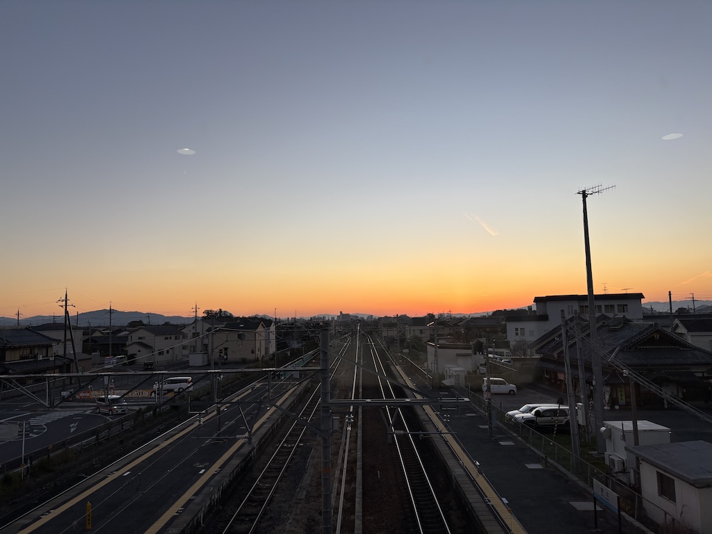 安土駅で、何人かがカメラを向けている方向を見ると、綺麗な夕焼けでした。