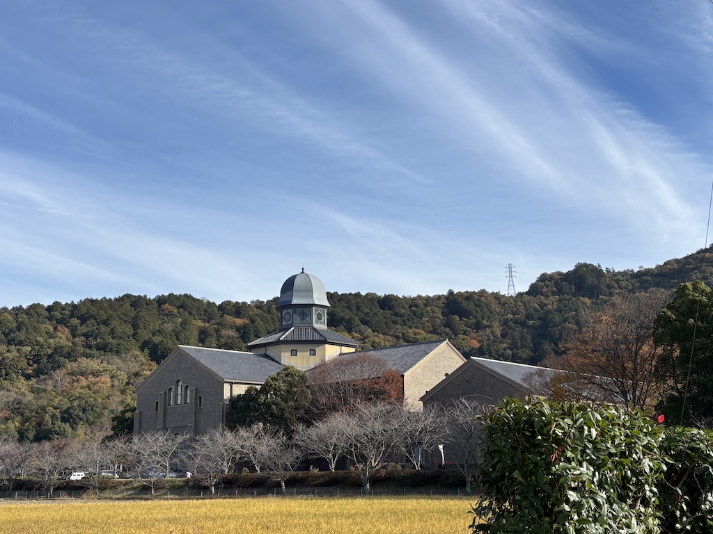 近づいてくる建物とその後ろにそびえる繖山(きぬがさやま)を眺めながら、気持ちが高まっていきます。