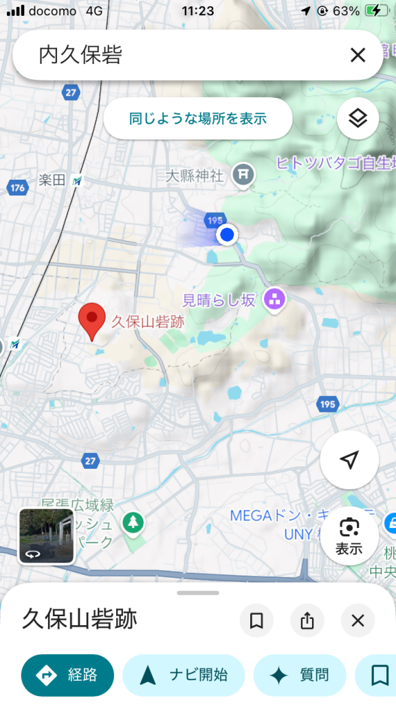 物狂峠とは、楽田城から東に大縣神社への参道(県道177号線)を進むと、途中分岐して小牧市池之内へと出る峠道(県道195号線)です。