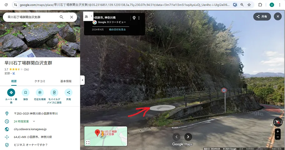 早川石丁場に行かれる際は、案内板もあるので、坂になっている側道(下画像の赤矢印のほう)を上ってから階段を下っていくといいです。そのあとは橋の下をくぐるので、頭上に注意です。
