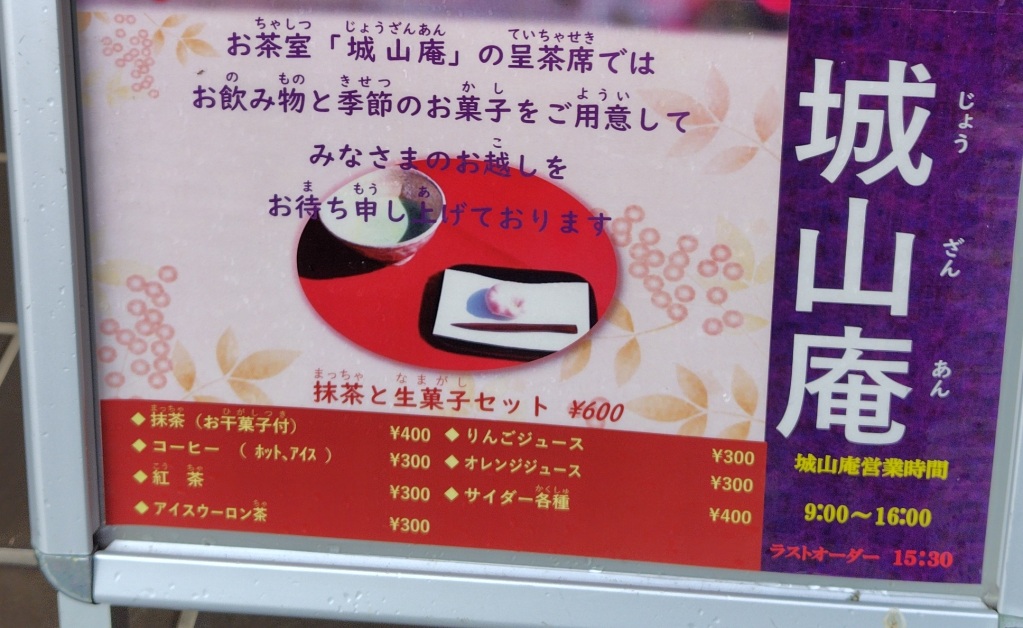 城山庵の営業時間は9:00~16:00(ラストオーダーは15:30)、喫茶のほかにも貸室や茶道体験教室なども行っているようです(大磯城山公園公式HP)。