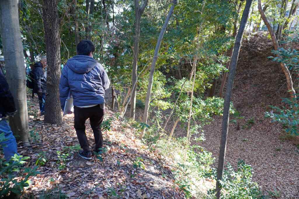 昔の測量図によると、この斜面に沿って竪堀が掘られていたことが記録されていたそうです。大手道(城の入口)が反対側だったことを考えると、ここは急斜面に加えて竪堀を掘ることで城の背後をがっちり固めていたようです。