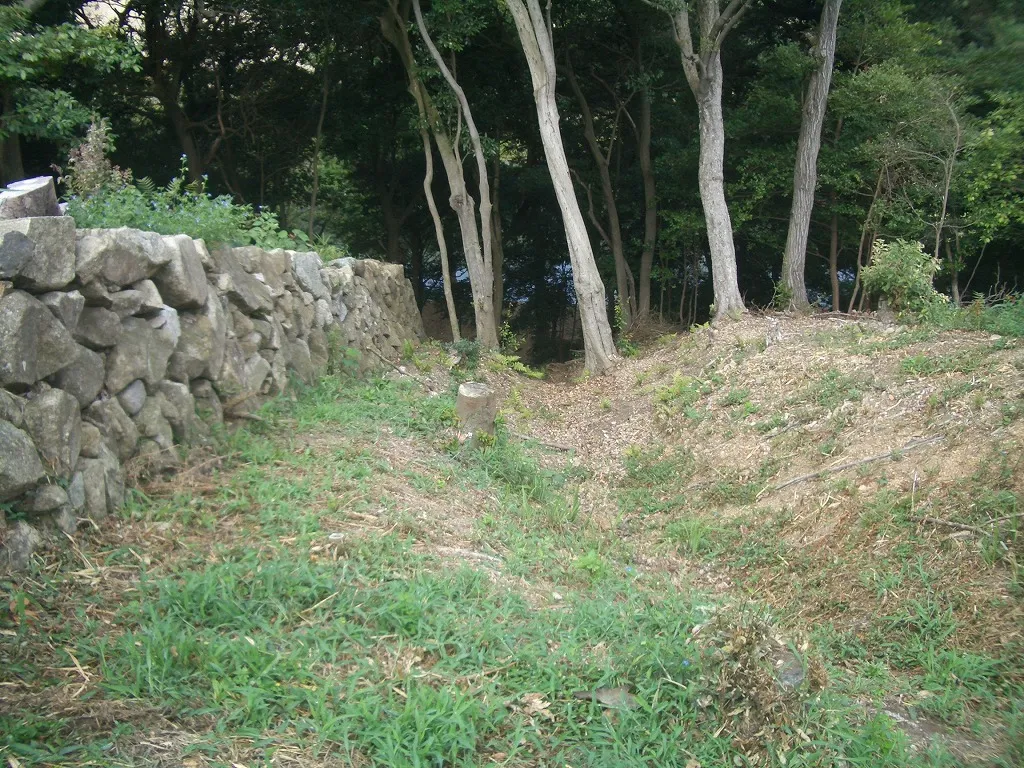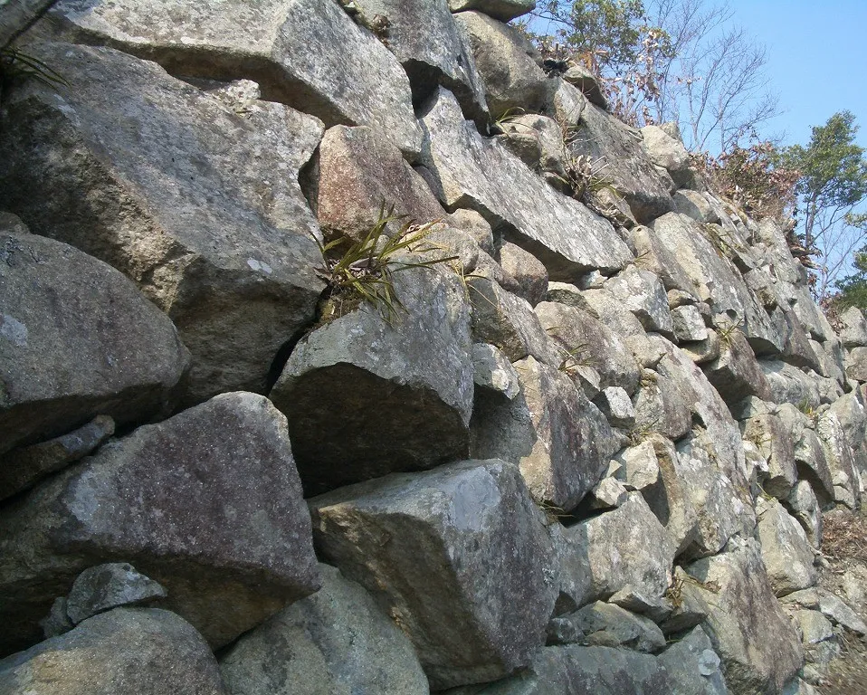 - 安土城が建つ20年前に寺院勢力による技術で石垣を積んでいた。矢穴と呼ばれる鏨(たがね)で割った技法によって積まれているこの時代では画期的なお城である。