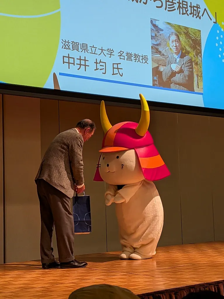 最後にひこにゃんが登場して、中井教授に滋賀名産のプレゼントを渡して第一部が終了しました(この時だけカメラ撮影が解禁になりました)。