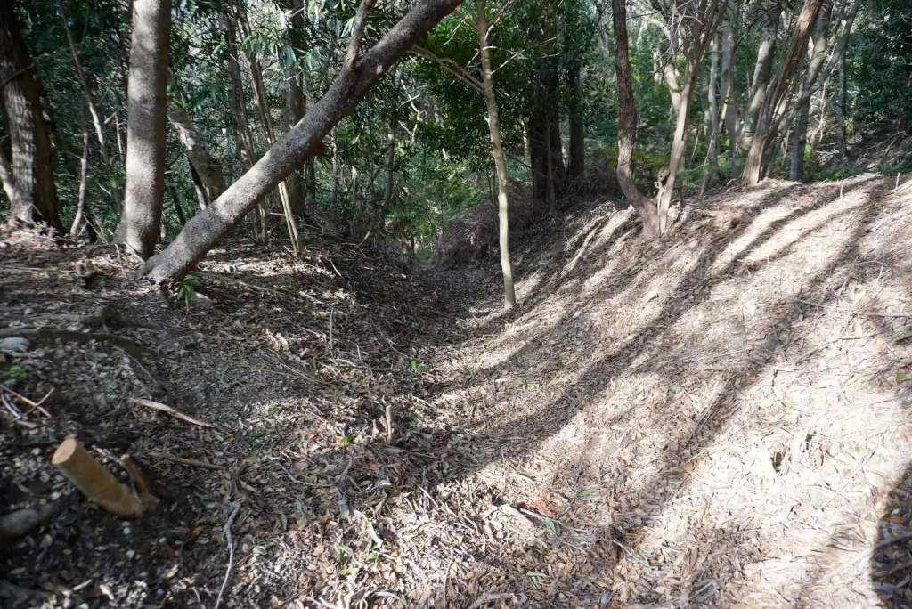 またしても堀切があり、容易には進めません。先ほど横から見たのとは別の堀切で、二段構えになっています。