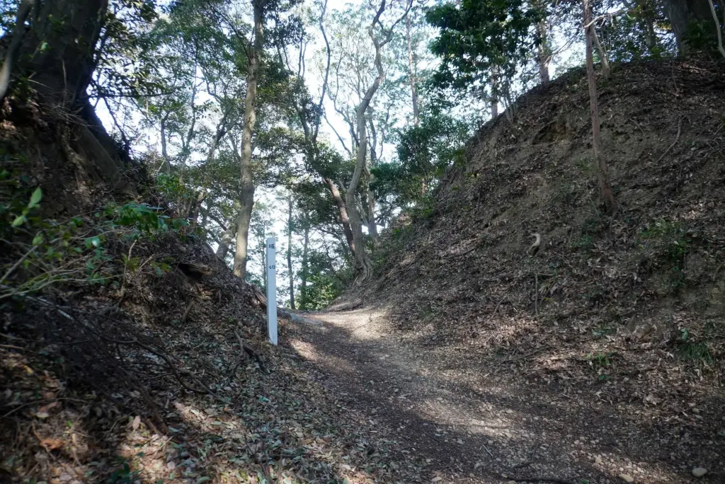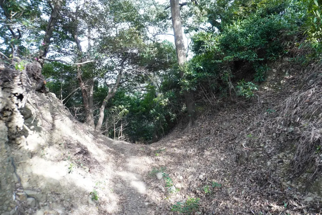 さらに進むと、大きな堀切に行く手を阻まれます。ここは一旦迂回して、戦国時代には無かった道から下に降りていきます。
