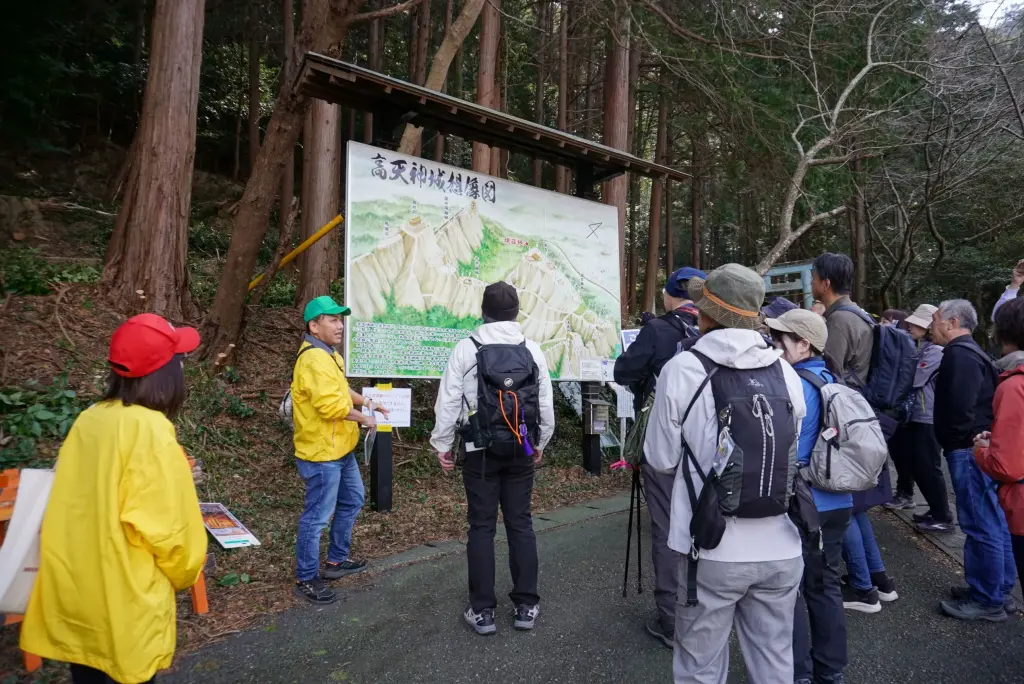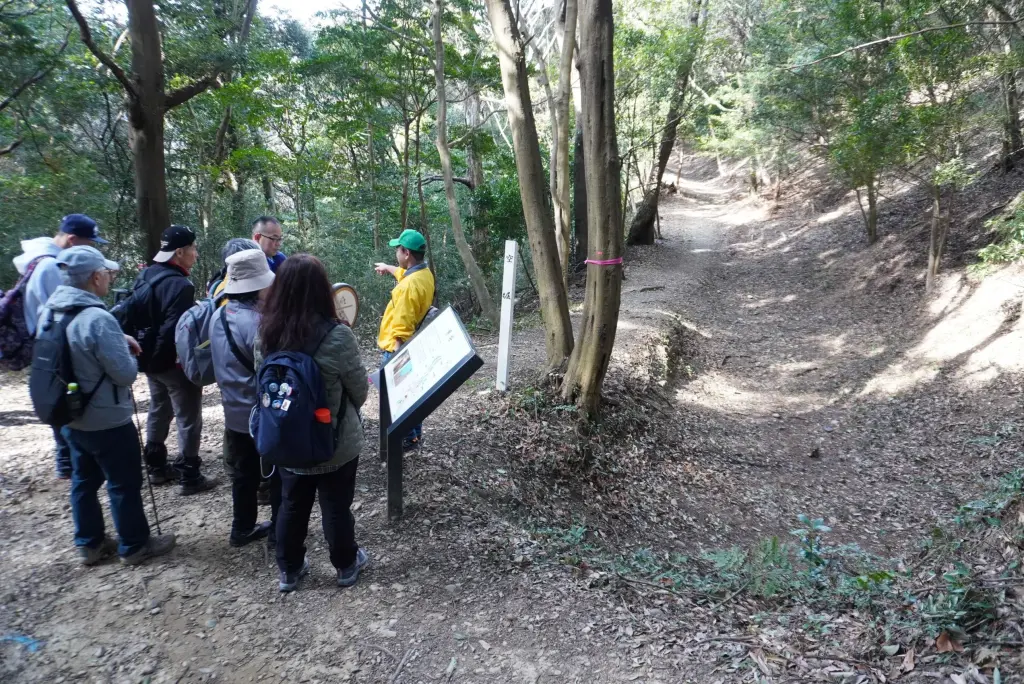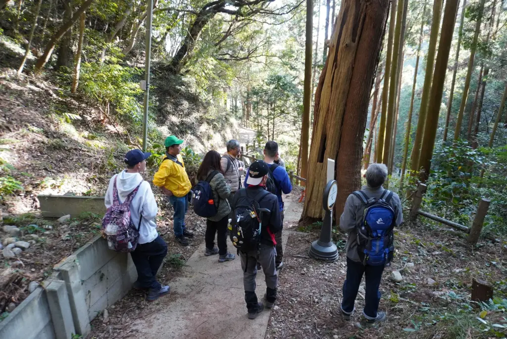 まずは登城口近くの看板の前で集合写真を撮り、お城の概要を説明していただきました。