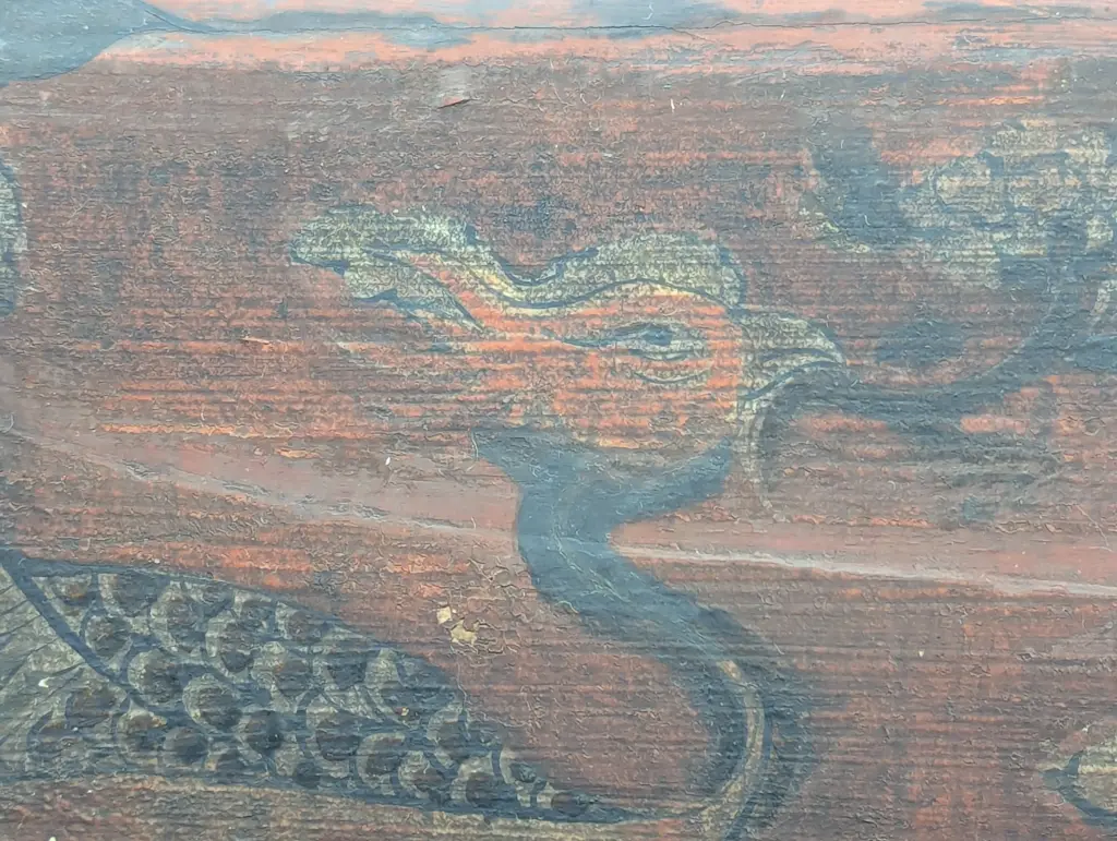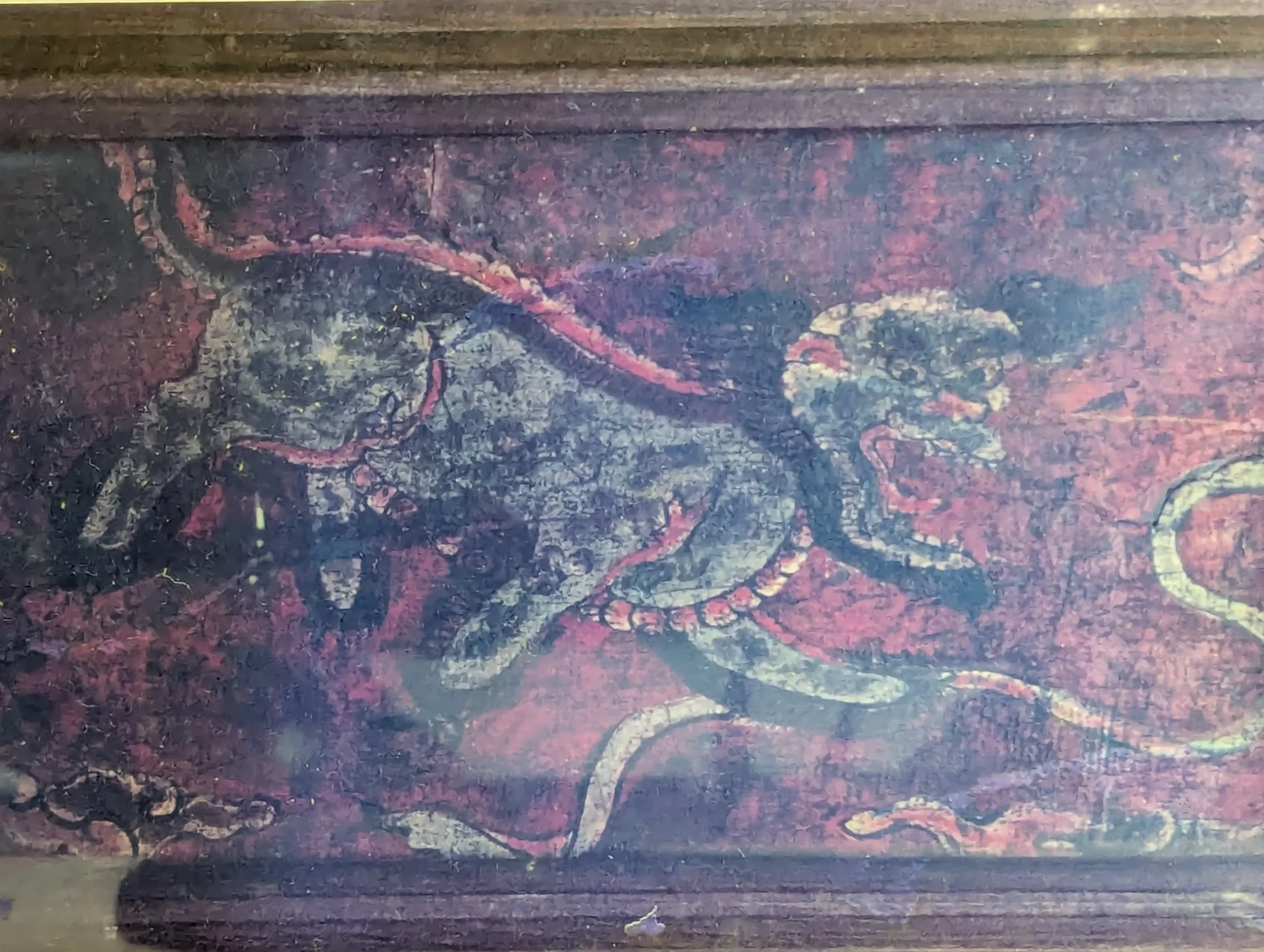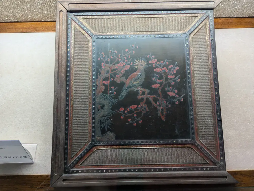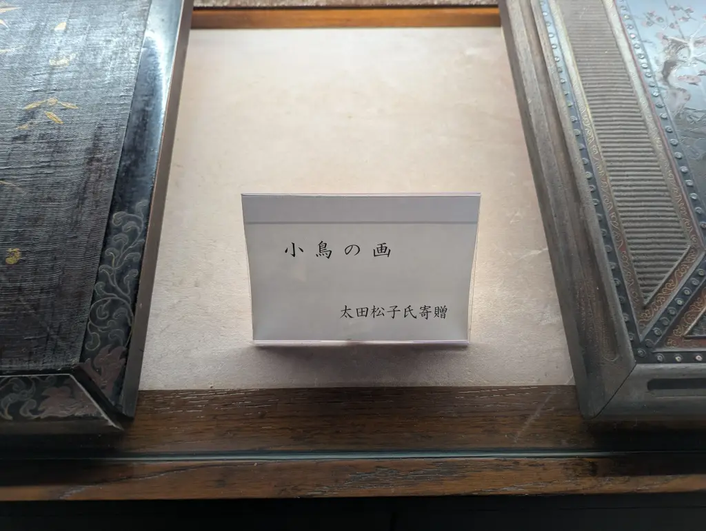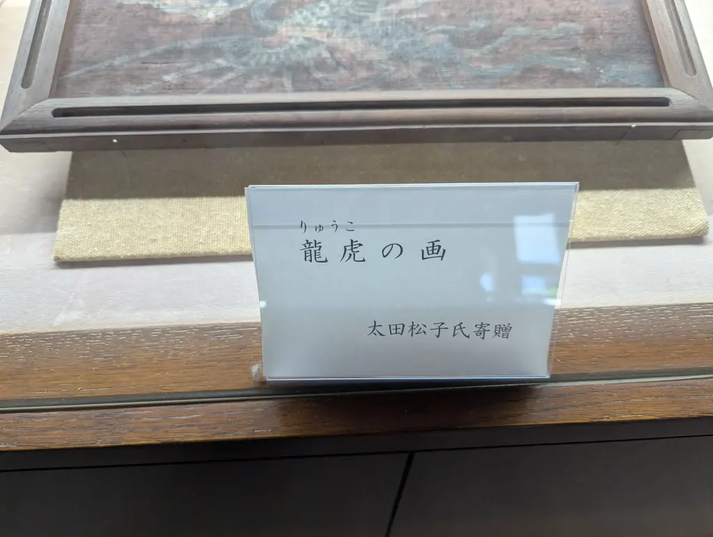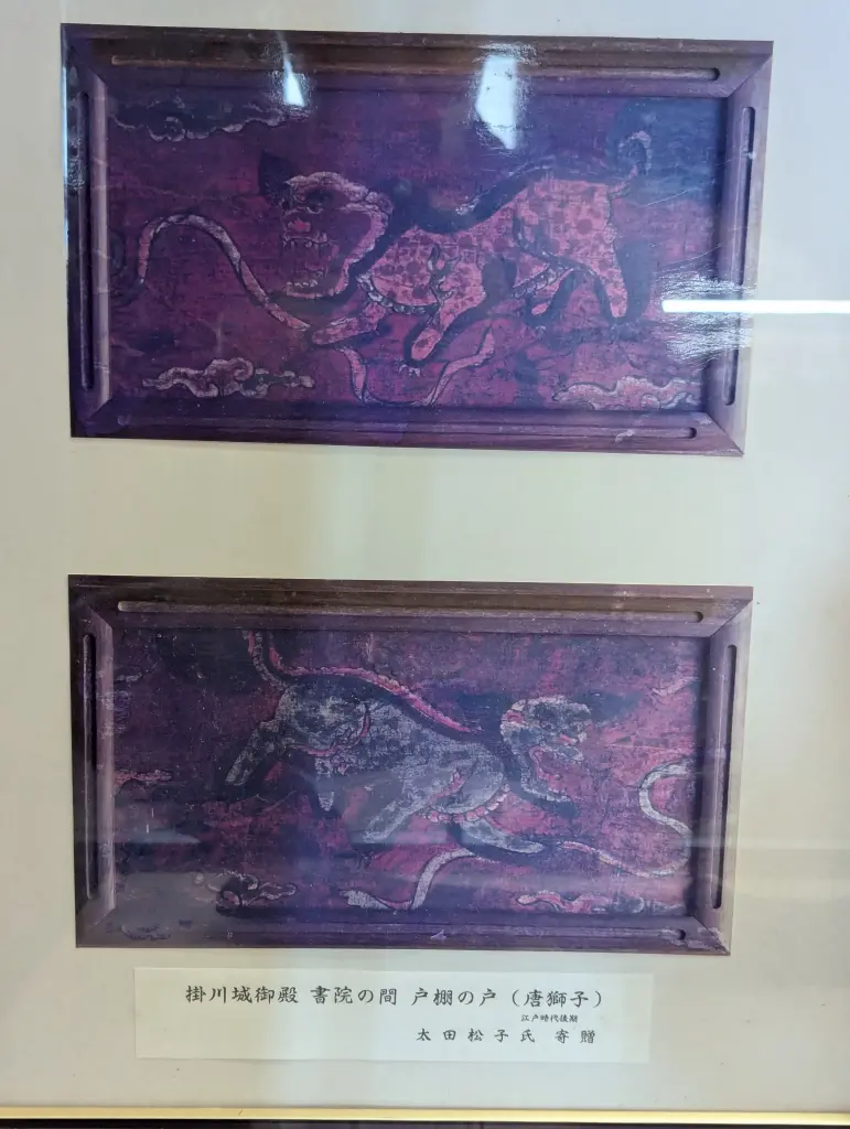 寄贈者の太田松子氏は掛川藩主・太田氏の子孫で「掛川城復元調査報告書」で「太田家当主太田松子氏」と紹介されている方かなと思いました。ちなみに、「龍虎の画」だけでは掛川城御殿の伝御殿障壁画だとは普通気がつかないですね。また、後で書きますが、龍虎ではなく、鳳凰と唐獅子のようです。